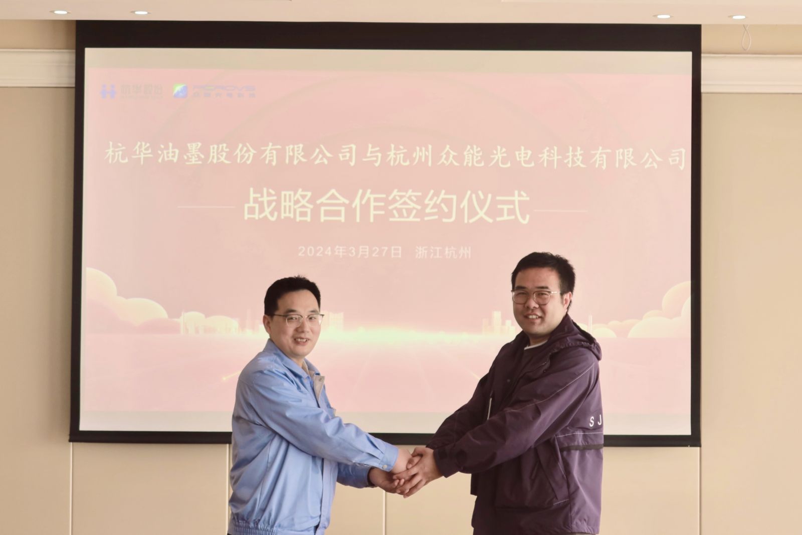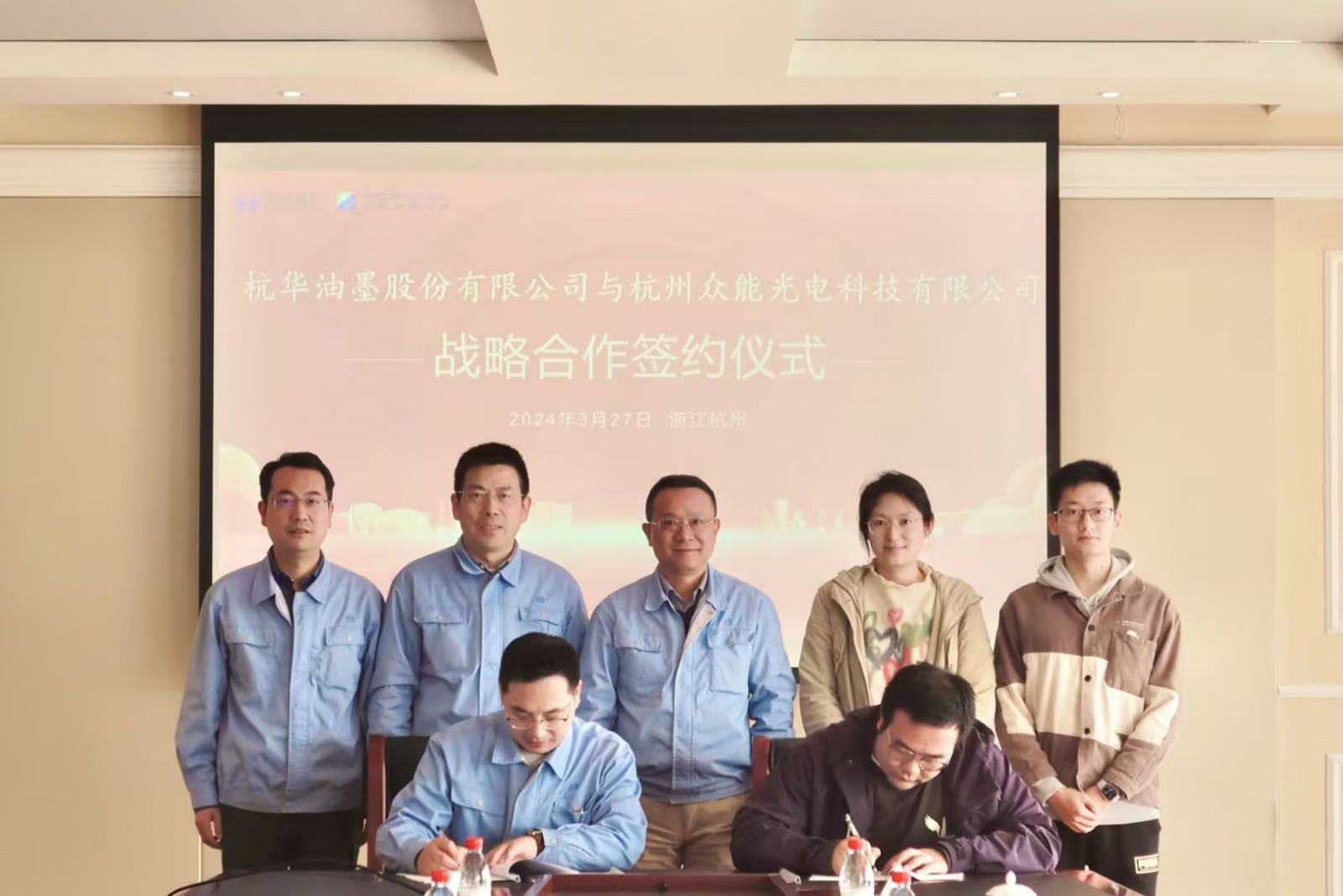 近日,杭华油墨股份有限公司(以下简称“公司”或“杭华股份”)与杭州众能光电科技有限公司(以下简称“杭州众能”)在杭州市签署战略合作框架协议,结成深度战略合作伙伴关系。杭华股份董事长、总经理邱克家先生,杭州众能总经理付超先生,以及双方高层领导等人员出席并见证签约仪式。