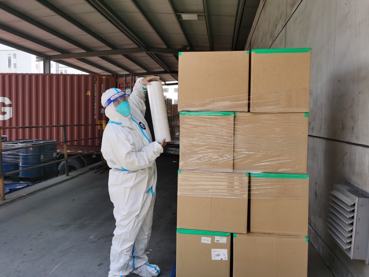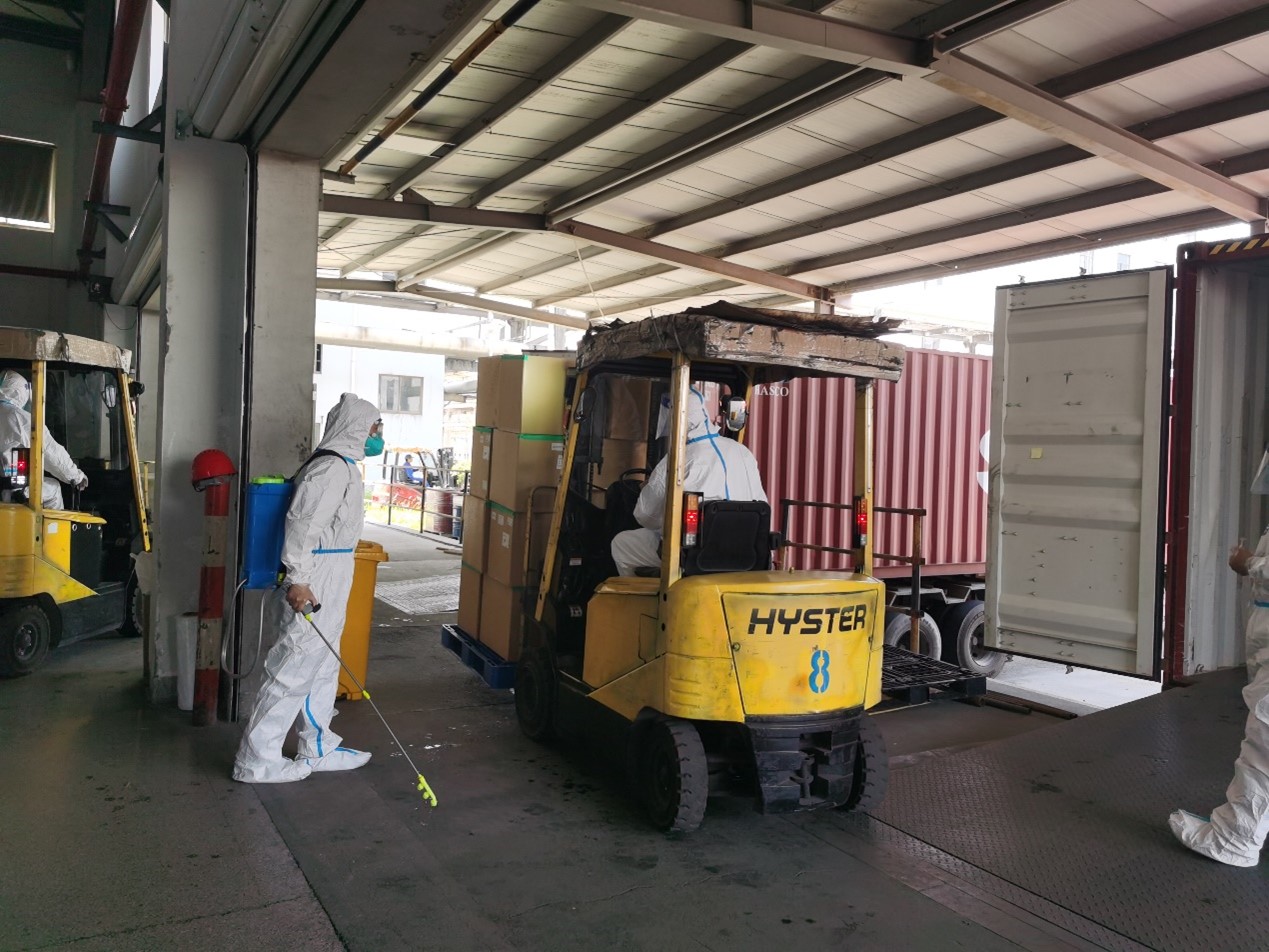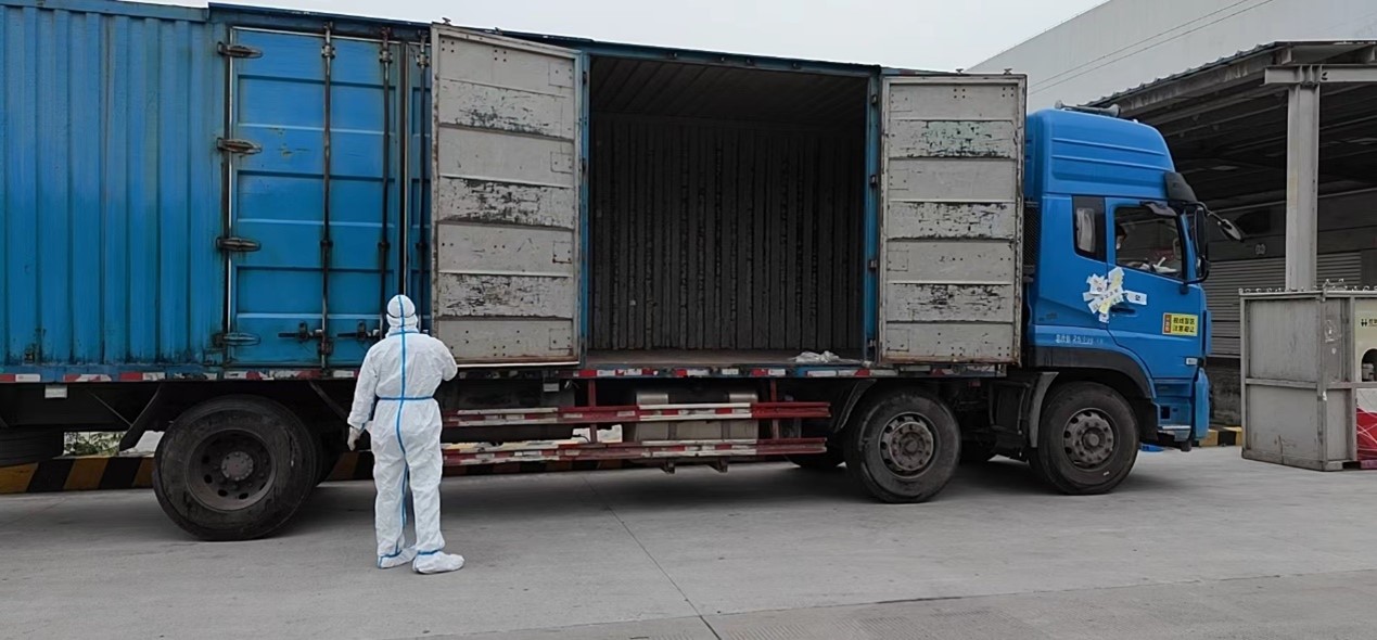 在对疫区、进口集装箱到货的车辆做好彻底的消杀工作,通过提高装卸效率,做到快进快出,强化对运输车辆的闭环管理;在装卸货物时,现场作业人员全程必须穿戴好防护服作业,卸货之前,卸货后都要进行彻底消杀;进入生产区域的货物在经过卸货消杀,室外静置消毒等流程,总务部联系第三方检测机构行核酸检测,检测结果合格之后,存放到指定库区,严格守住生产保障物料关。